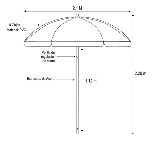 Contiene salidas de aire, estructuras de acero, 2.1m de diámetro, 2.34m máx y 2.24m mínimo y 8 gajos.